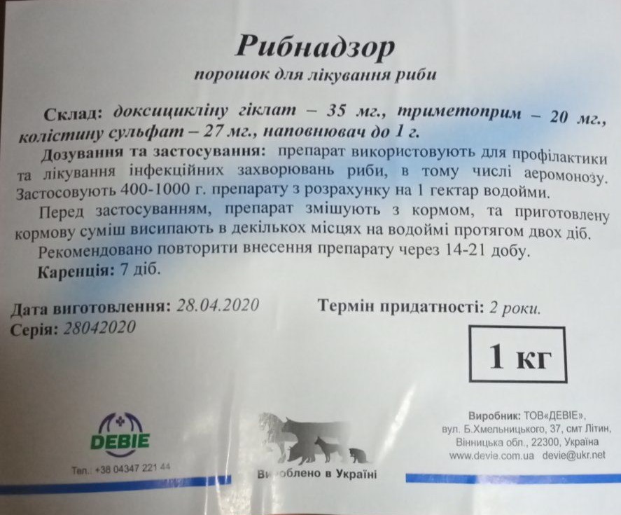 Делают лечебно-кормовую смесь (ЛКС): 1 кг вещества тщательно перемешивают с 99 кг комбикорма (соответствующего рецепта для каждой возрастной категории рыбы).