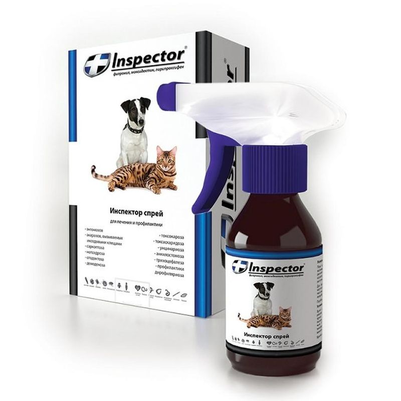 Спрей Инспектор – в качестве действующих элементов содержит фипронил – 0,4%, пирипроксифен – 0,2%, моксидектин – 0,1%. Входящие в состав вещества действующие элементы гарантируют его обширный диапазон противопаразитарного воздействия в отношении блох, власоедов, саркоптоидных и иксодовых клещей, личиночных и половозрелых фаз формирования нематод, ведущих паразитическую деятельность на кошках и собаках.