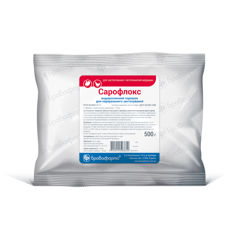 Быстро всасывается из ЖКТ в кровь и проникает во все органы и ткани организма. Биодоступность у бройлеров при пероральном применении составляет 59,6 ± 13,8%. Максимальная концентрация в крови достигается через 1,5-3 часа после применения. Период полувыведения у бройлеров - 3,89 ± 1,19 часов. В печени птицы сарафлоксацин в незначительном количестве метаболизируется до сульфаминовой и глюкоронидних соединений. Биологический период полураспада составляет 30,13 часов. Выводится в основном с калом и мочой преимущественно в неизмененном виде.